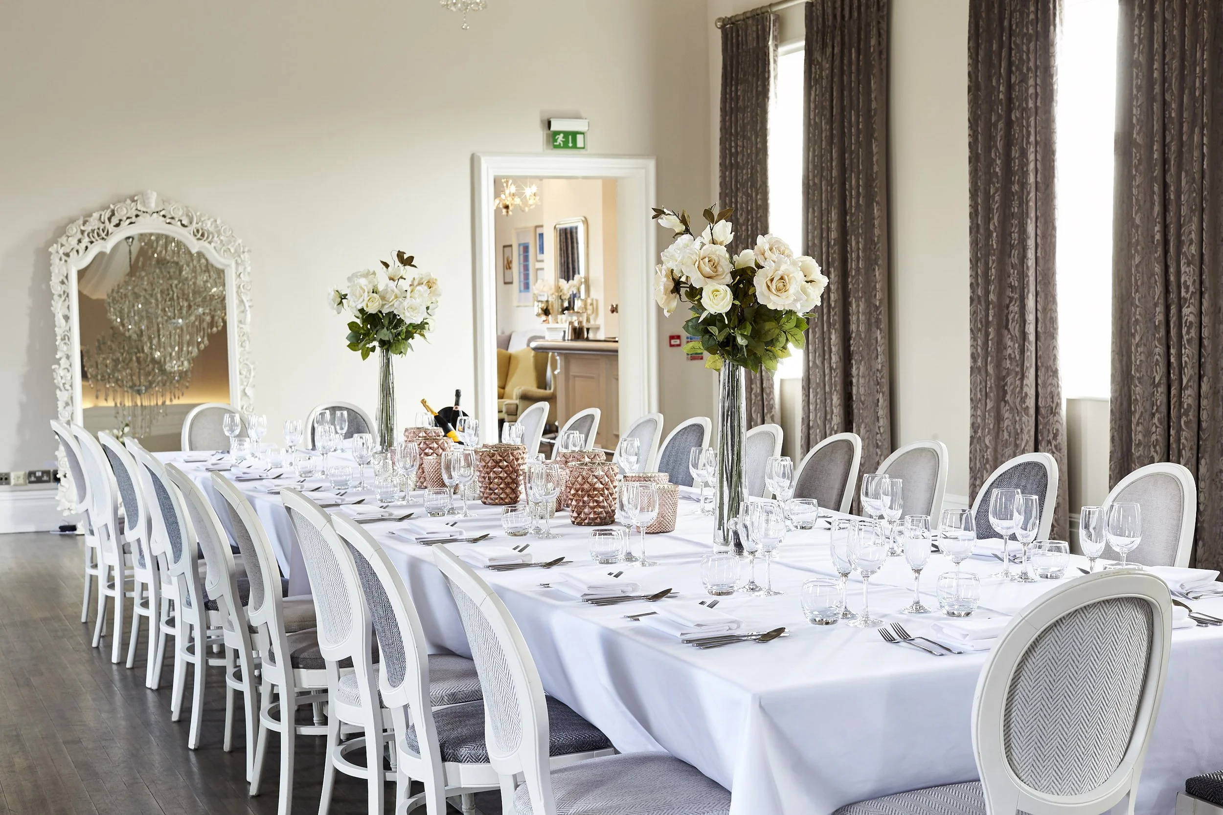 Eight huge glittering chandeliers add a touch of old world glamour and the huge white windows are dressed in billowing curtains. The decor is elegant, classic and suits any scheme you may have in mind for your celebration.